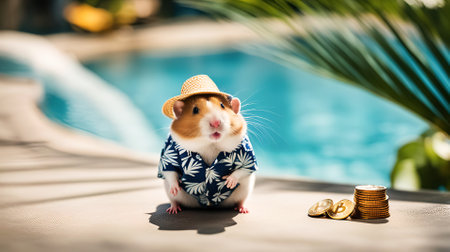 A hamster in a straw hat by pool against the backdrop of a tropical resort enjoys his vacation. Funny animal, online game hero, businessman on vacation