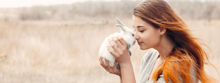 Rabbit. The girl holds a real lop-eared rabbit and poses with him for the camera. girl plays with a gray, brown rabbit outdoors. Get in the arms of a girl. Photo banner, concept for Easter holiday