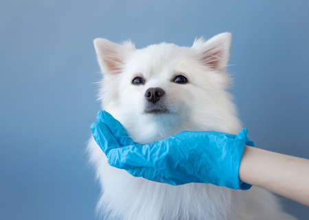 A small white Pomeranian dog holds its head over the palm of a blue medical glove