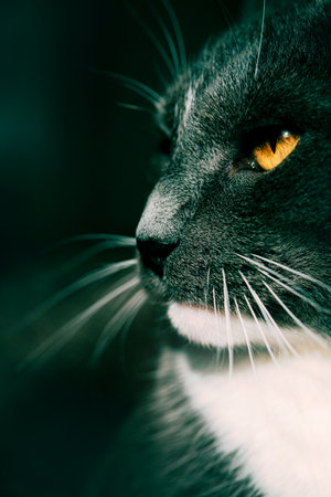 Portrait of a beautiful domestic cat with gray fur and yellow eyes, in profile. This is a pet.