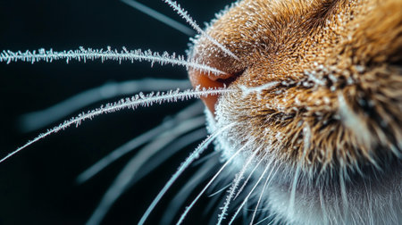 Close-up of ginger cat's nose covered with hoarfrost