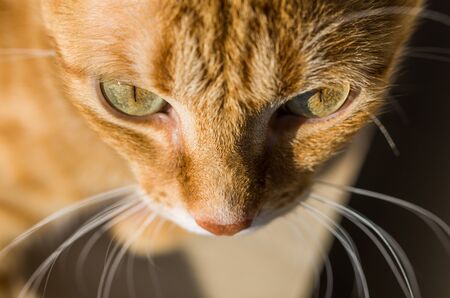 Close up portrait of a tabby cat. Shallow depth of field. Portrait of a house cat, a cat with reddish-brown fur.