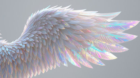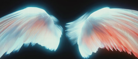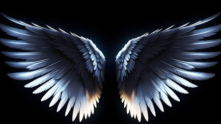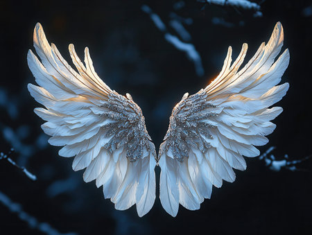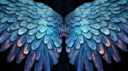 Mystical angelic wings glowing with intricate feathers against a dark backdrop