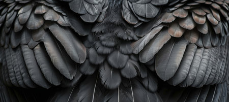 Detailed close-up of a raven's wings against a black background. The image showcases the intricate detail of the feathers.