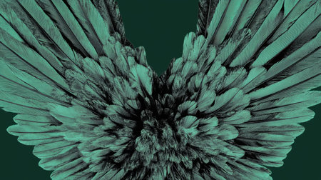 This stunning image features an artistic display of vibrant feathers arranged into wings, showcasing intricate patterns and textures against a soft green background.
