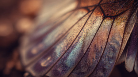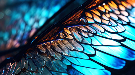 Detailed close-up of a butterfly wing showcasing vibrant colors and intricate patterns in natural light