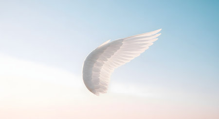 A single, pristine white angel or bird wing is shown floating serenely against a soft, pastel-colored sky. The minimalist and ethereal image evokes concepts of freedom, spirituality, purity, hope, and lightness.