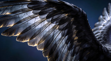 Sophisticated digital artwork with semi-sheer translucent effects, intricate vein patterns, and dramatic edge lighting for an aura of avian mystique and elegance. Ideal for fantasy graphics, gothic branding, 3D texture overlays, tattoo designs, book covers, and wildlife-inspired visuals. Versatile asset for creative professionals in gaming, fashion, publishing... AI-generated digital illustration. AI-generated illustration.