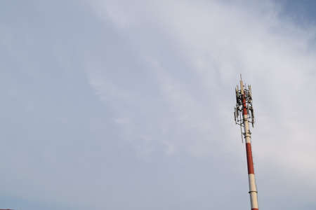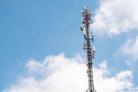 Mobile phone communication antenna tower with the blue sky and clouds