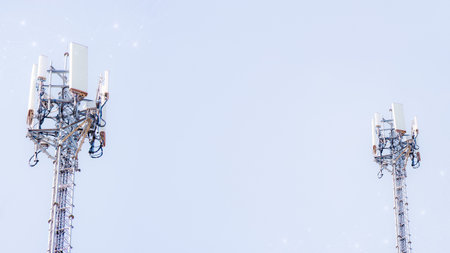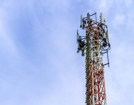 Cellular Base Station or Base Transceiver Station. Telecommunication tower. Wireless Communication Antenna Transmitter. 3G, 4G and 5G Cell Site with blue and cloudy sky.