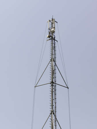 mobile phone communication and network signal repeater antenna tower with blue sky background