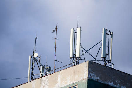 5G and 4G mobile phone antennas installed on the rooftop of a building. Blue sky
