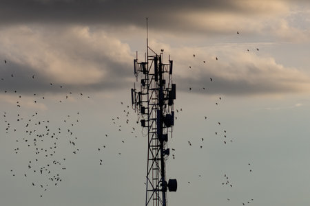 Silhouette of a telecommunication tower with a flock of birds