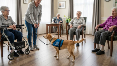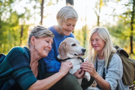 Close up of couple in wheelchairs petting dog in park outdoors, copy space