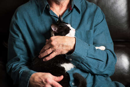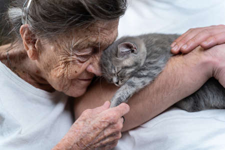 Male assistant, volunteer and senior woman with cute kitten cat with lovely moment, pet and an old human concept. Love of pets, love and care of cats, best friends, cat love, loved and happy pets.