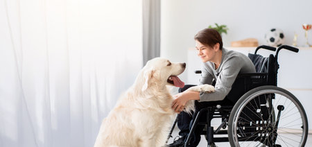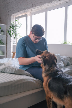 Happy impaired teenager playing with his dog at home, full length portrait. Animal human friendship concept