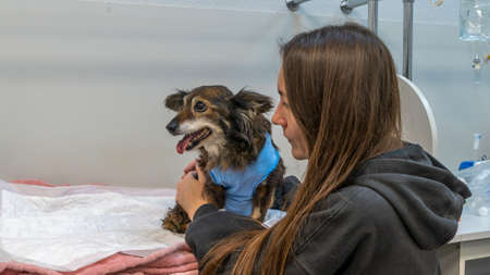 Happy woman with dog at vet clinic. The owner and his dog at a treatment room in a veterinary clinic. Pet healthy concept.