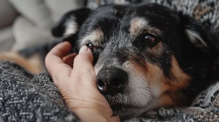 owner petting his dog, while he is sleeping or resting with closed eyes