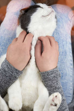 Close up of a cute sleeping kitty-cat in the womans hands. Woman stroking her lovely little pet. Indoor.