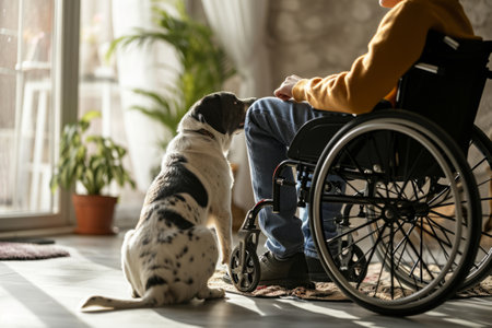 Young bearded man embracing with his lovely dog while sitting in wheelchair in living room
