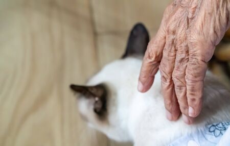 An elderly woman's hands are stroking a tabby cat that is squinting with pleasure. Life of Pets.