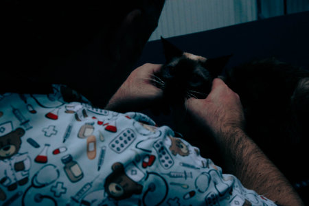 A female hand gently petting a domestic cat's head, showing affection and care. A close-up shot captures a tender moment of human interaction with a beloved feline companion. A lovable pet indoors.