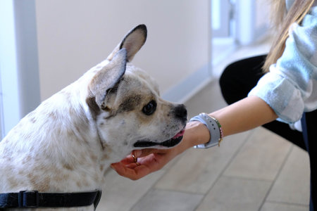 From above crop hand caressing calm white and brown Jack Russell Terrier dog dog lying on a pillow at home at owner