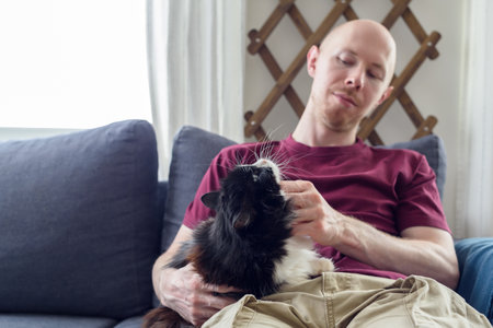 Close up photo of man enjoying and cheering up with domestic cat and relaxing comfortable red sofa.