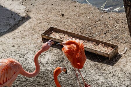 Flamingos with bright colors live in flocks near the pond. The plumage is pink and orange. Keeping individuals with long necks and powerful curved beaks in the zoo