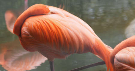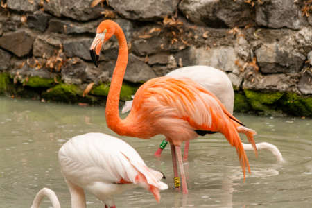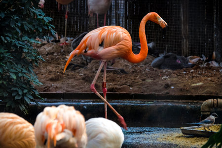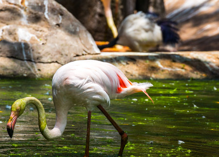 flamingo resting and feeding in captivity. beautiful bird with vibrant colors.