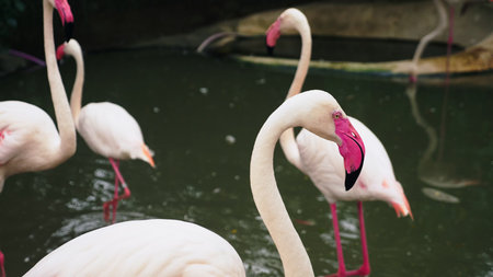 Group of Greater Flamingo (Phoenicopterus roseus) in the public park. Flamingos are very beautiful birds, long necks and legs, pink feathers, black wings, pink beak, black wing tip.