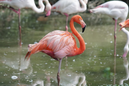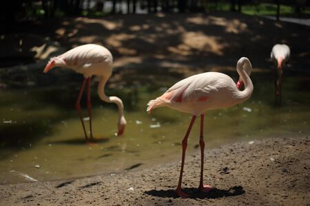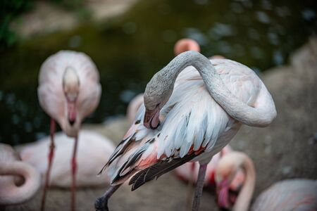 Group of flamingos next to the lake drinking water and live in natural zoo surrounding
