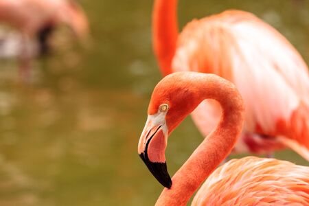 Beautiful bright red-orange flamingo with a curved neck close-up.