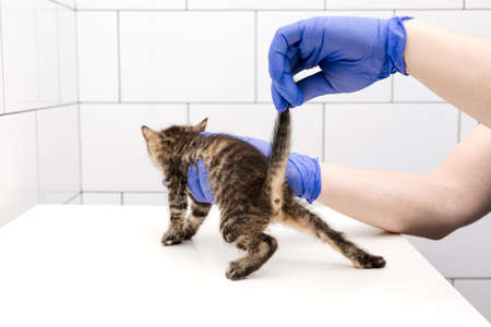 Checkup and treatment of kitten by a doctor at a vet clinic isolated on white background, vaccination of pets, look down the tail.