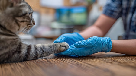 Veterinarian in blue gloves gently holding a domestic cat's paw, symbolizing care, trust, and professional animal healthcare during a clinic visit or check up