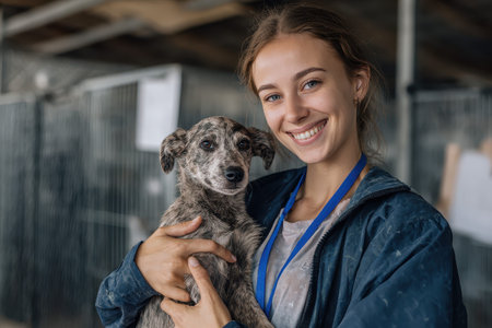 Cheerful volunteer smiles while holding a small dog at the animal shelter during a community outreach event in autumn