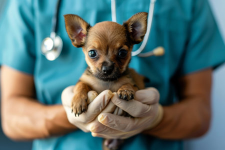 Veterinarian holding a puppy in her hands. Veterinary clinic.