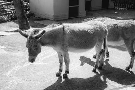 Two peaceful domestic donkeys having rest on the farm on a sunny day