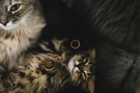 gold wedding rings lies on a little sleeping kitten cat near or between other cats.Sweet gray cat sleeping among his mother and father.sweetest cats photo wedding atmosphere. Cats on the wedding