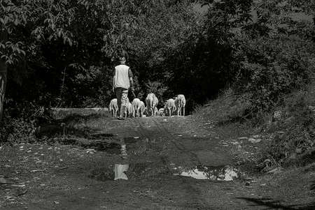 Shepherd following behind his flock of sheep