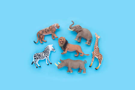 Plastic jungle animal toys on blue background.