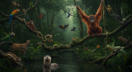 Orangutan and tropical birds in the jungle. 3D rendering