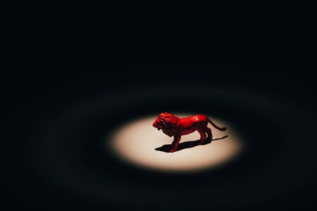 Red toy lion under spotlight on black background