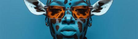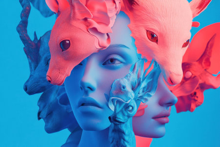 Surreal portrait with vibrant colors featuring a model intertwined with animal faces, showcasing a unique blend of emotions and imaginative design