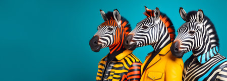 Creative animal concept. zebra in a group, vibrant bright fashionable outfits isolated on solid background advertisement, copy text space. birthday party invitation