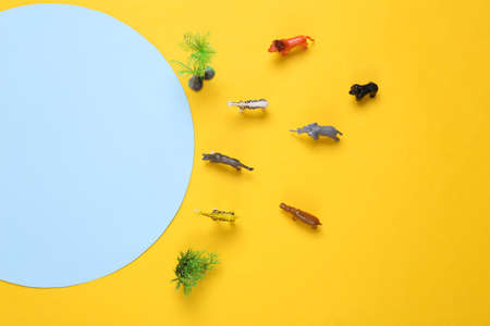 Toy wild animals on yellow background. Save animals concept.