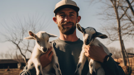 Boy holded baby goat face for presenting natural animal lifestyle concept.