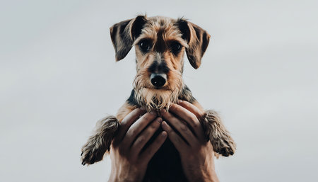 Close-up of Airedale Terrier held by person with grey background.