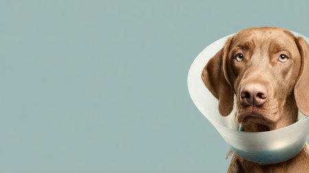 Sad dog lying on a bed sick with vet plastic Elizabethan collar on neck. A dachshund in a dog collar. Treatment of Pets. Operation of dogs and animals. Veterinary clinic for dogs banner