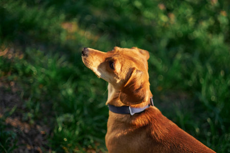 Beautiful ginger dog sitting in the garden at the sunset looking aside . Green grass, summer conceptHigh quality photo